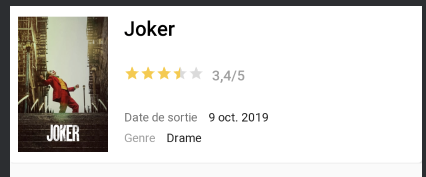 Pour les Ă©toiles de la note du film, une RatingBar, sur laquelle on utilisera l'attribut isIndicator="true" pour empĂȘcher les utilisateurs de modifier le nombre d'Ă©toiles.