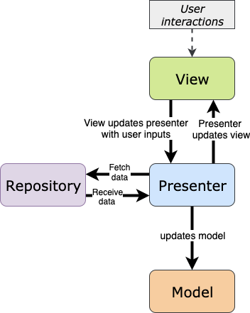Le Presenter reçoit les actions de l'utilisateur et sera en charge de récupérer les données pertinentes du Model dans le Repository. Il permet de faire le lien entre la View et le Model.